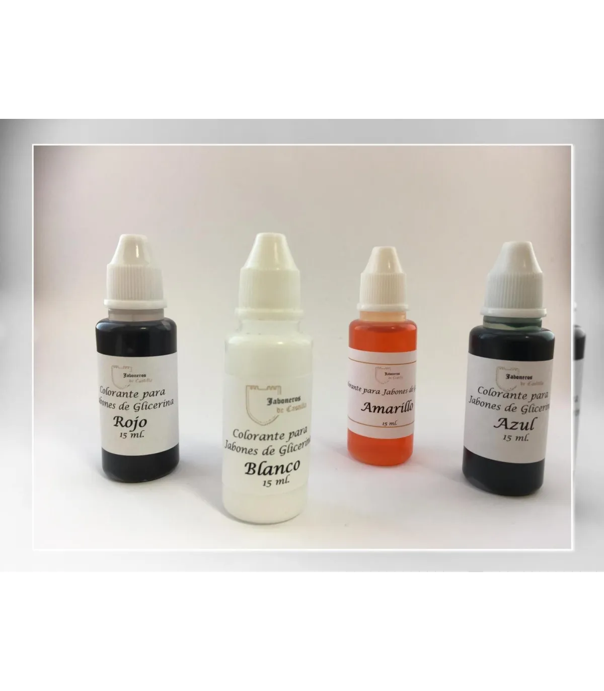 Pack de 4 colorantes líquidos Amarillo, Azul, Rojo y Blanco, especial para Jabones Base de Glicerina Transparentes y Blancos, alto rendimiento. Con un bote de 15 ml. puede teñir hasta 100Kg de Jabón, se puede mezclar entre si para obtener diferentes colores, muy duradero y economico.